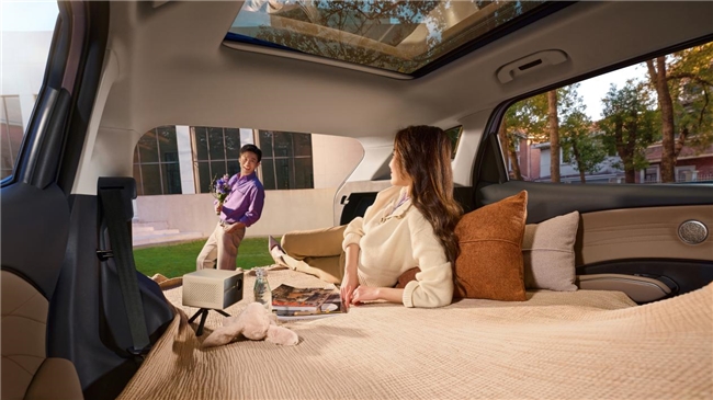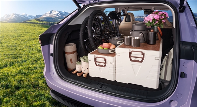 这份空间的慷慨,更体现在对生活细节的全盘收纳。639L的常规后备箱容积,轻松容纳儿童推车、登机箱与各类购物袋;后排座椅灵活放倒后,可以秒变2㎡大床,无论是小憩还是露营过夜,都舒适感拉满。如若不想“躺平”,超大空间还可以将全家出游的行李箱、露营帐篷、充气床垫、折叠桌椅等物品轻松收纳。此外,车内36 处精细化储物空间覆盖门板槽、杯架、中央扶手箱等细节,手机、钱包、水杯、零食等随身物品随手归置,始终保持座舱的清爽体面。